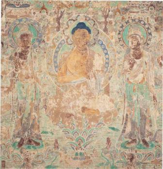 さらに敦煌莫高窟、そして法隆寺の金堂壁画は日本の仏教絵画、すなわち「ほとけを描くもの」の、源泉となるものです。中国の敦煌莫高窟では、4世紀半ばから14世紀にかけての非常に長い期間にわたって、造営が続けられました。そのなかでも、7世紀からの唐代は、ちょうど日本に仏教が伝わった時期にあたります。教えだけでなく、日本でも仏の姿を描きあらわすようになったとき、唐代の絵画はその「お手本」となったのです。日本における最古の本格的な仏教壁画として法隆寺金堂壁画に目を向ければ、そこには敦煌莫高窟における唐代壁画と共通する要素を見いだすことができるでしょう。