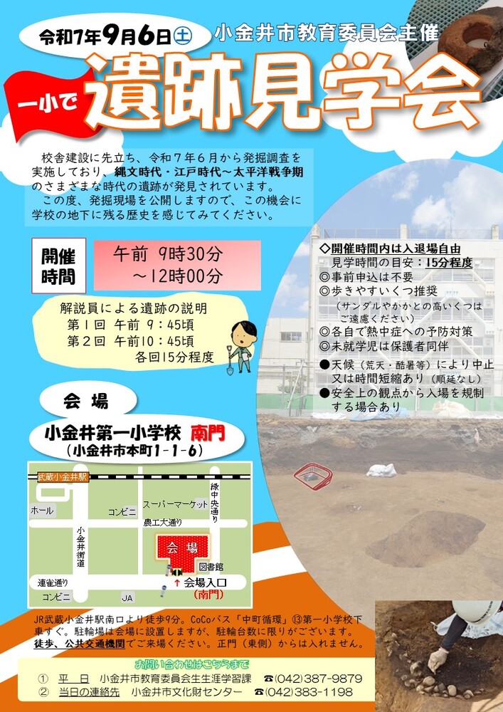 令和7年9月6日(土曜)に開催を予定していた小金井市立小金井第一小学校の遺跡見学会は、開催を中止することといたしました。