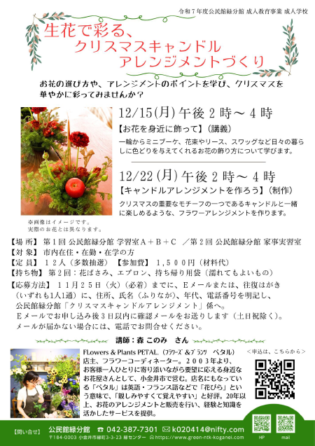 公民館緑分館 成人学校「生花で彩る、クリスマスキャンドルアレンジメントづくり」を開催します