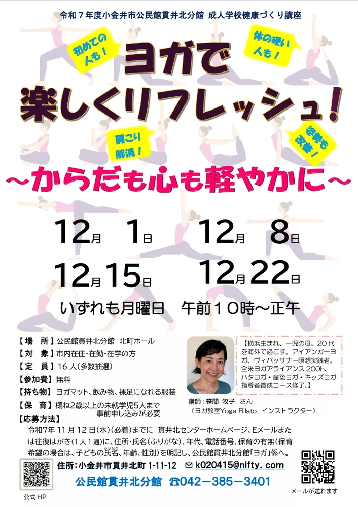 7. 公民館貫井北分館 成人学校 健康づくり講座「ヨガで楽しくリフレッシュ!―からだも心も軽やかに―」を開催します