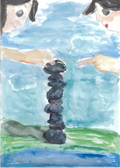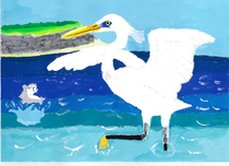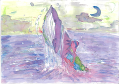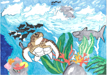 私が環境について考えたとき、まず海と鯨のことが思い浮かびました。 海洋汚染で鯨の尾の方が汚れています。そんな環境の中でも自由に泳ぐ鯨の姿を描きました。